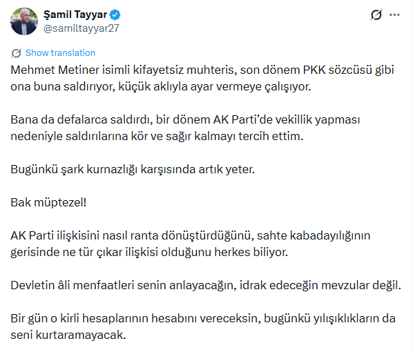 Şamil Tayyar ise, Metiner’in sözlerine sert bir karşılık vererek “Mehmet Metiner isimli kifayetsiz muhteris, son dönem PKK sözcüsü gibi ona buna saldırıyor, küçük aklıyla ayar vermeye çalışıyor. Bana da defalarca saldırdı, bir dönem AK Parti’de vekillik yapması nedeniyle saldırılarına kör ve sağır kalmayı tercih ettim. Bugünkü şark kurnazlığı karşısında artık yeter.” ifadelerini kullandı