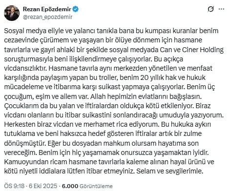 “Sosyal medya eliyle ve yalancı tanıkla bana bu kumpası kuranlar benim cezaevinde çürümem ve yaşayan bir ölüye dönmem için hasmane tavırlarla ve gayri ahlaki bir şekilde sosyal medyada Can ve Ciner Holding soruşturmasıyla beni ilişkilendirmeye çalışıyorlar. Bu açıkça vicdansızlıktır. Hasmane tavırla aynı merkezden yönetilen ve menfaat karşılığında paylaşım yapan bu troller, benim 20 yıllık hak ve hukuk mücadeleme ve itibarıma karşı suikast yapmaya çalışıyorlar. Benim üç çocuğum, eşim ve ailem var. Allah hepimizin evlatlarını bağışlasın. Çocuklarım da bu yalan ve iftiralardan oldukça kötü etkileniyor. Biraz vicdanı olanların bu itibar suikastini sonlandıracağı umuduyla yazıyorum. Herkesten biraz vicdan ve merhamet rica ediyorum. Bu hukuka aykırı tutuklama ve beni haksızca hedef gösteren iftiralar artık bir zulme dönüşmüştür. Eğer bu dosyadan mahkum olursam hayatıma son vereceğim. Benim için hiç yaşamamak onursuzca yaşamaktan iyidir. Kamuoyundan ricam hasmane tavırlarla kaleme alınan hayal ürünü ve kötü niyetli iddialara lütfen itibar etmeyiniz. Selam ve sevgilerimle.”