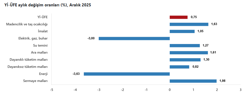 Yİ-ÜFE (2003=100) endeksi, 2025 yılı Aralık ayında bir önceki aya göre %0,75 artış gösterirken, geçen yılın aynı dönemine göre %27,67 ve on iki aylık ortalamalara göre ise %25,36 arttı.